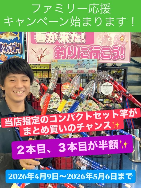 こんにちは、はっしーです!2026年4月9日〜2026年5月5日までの期間で!『ファミリー応援キャンペーン開催』当店指定のコンパクトロッドセットが2本目、3本目が半額に!✨✨ご家族やお友達とゴールデンウィークの釣りに如何ですか?