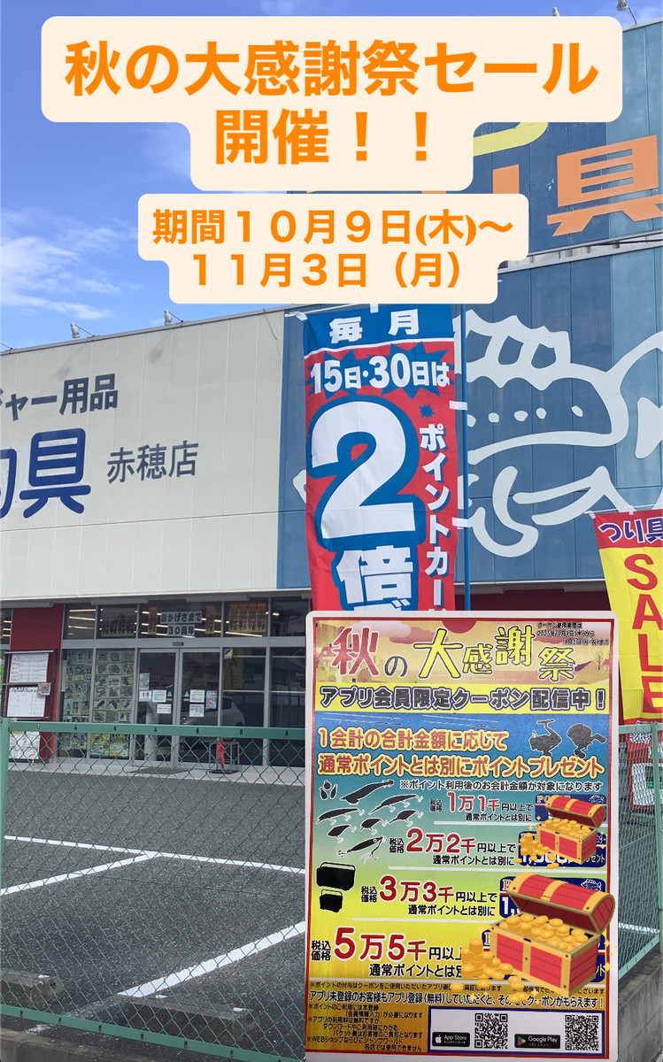 赤穂店の細井です。秋の大感謝祭セールが始まります。皆様のご来店をお待ちしております。